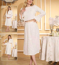 A chic and feminine two-piece outfit featuring a modern design composed of a short blouse and a mid-length skirt. Adorned with delicate, shimmering embroidery that adds a touch of luxury without exaggeration. The wide sleeves lend fluidity and charm, making it a perfect choice for elegant evening occasions or simple gatherings with a modern-classic vibe.