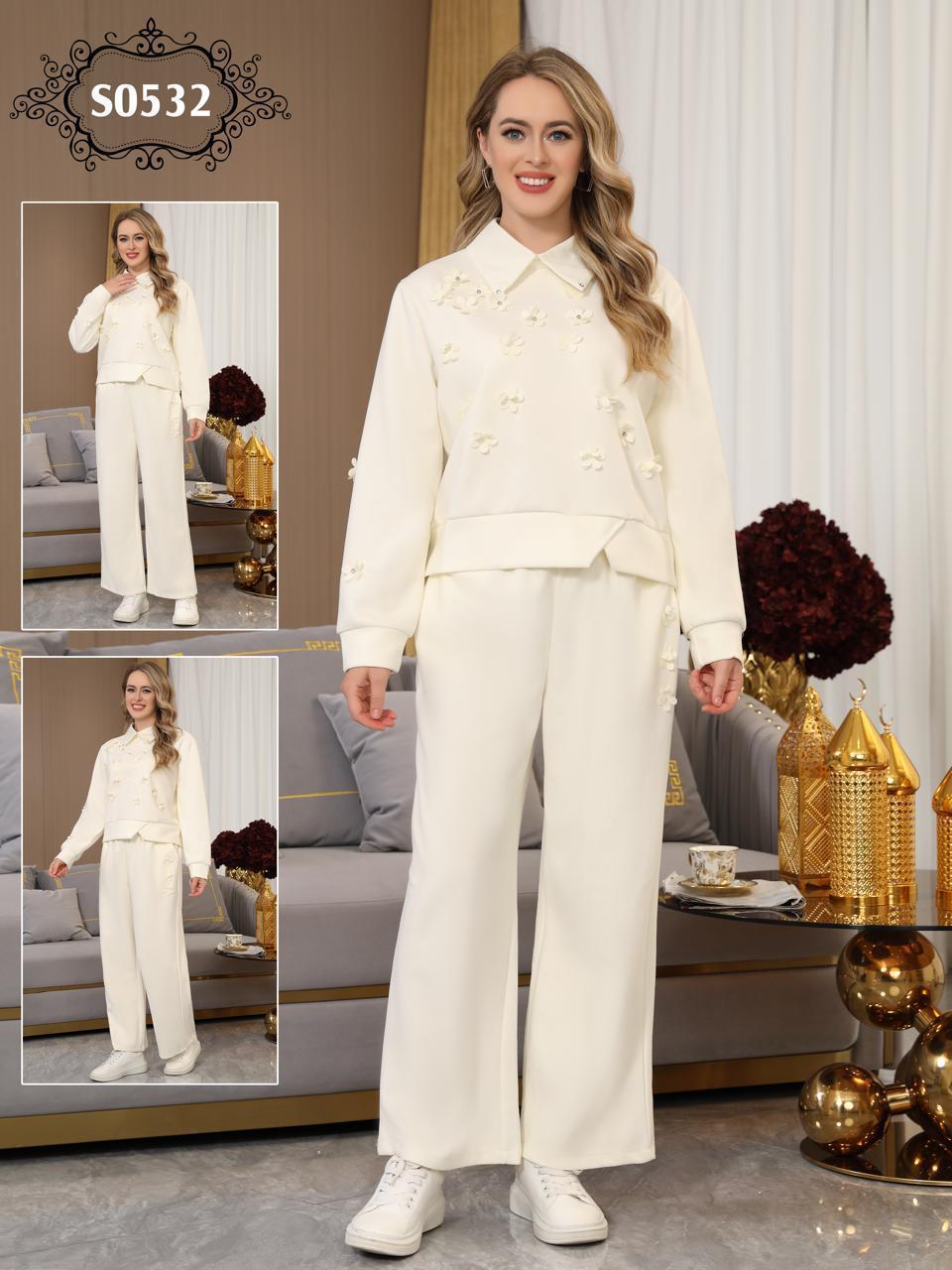The pants come in a straight, wide-leg cut that ensures freedom of movement and understated elegance — making this set an ideal choice for refined everyday looks, travel, or calm, graceful gatherings.