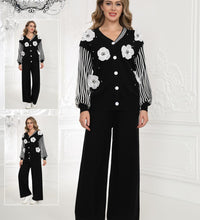 The jacket features a V-neckline with white striped edges and vertically striped sleeves that create a striking, sophisticated look. The chest and shoulder areas are adorned with 3D floral appliqués and pearl embellishments, adding a touch of feminine elegance.