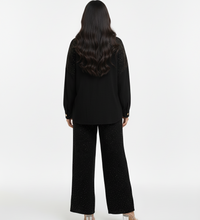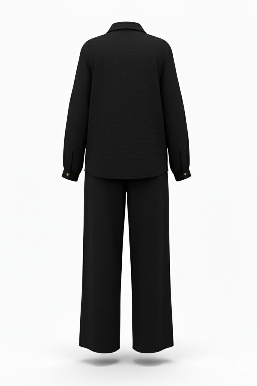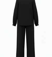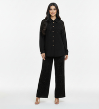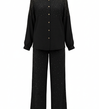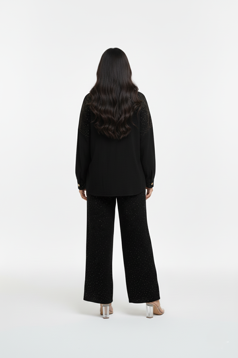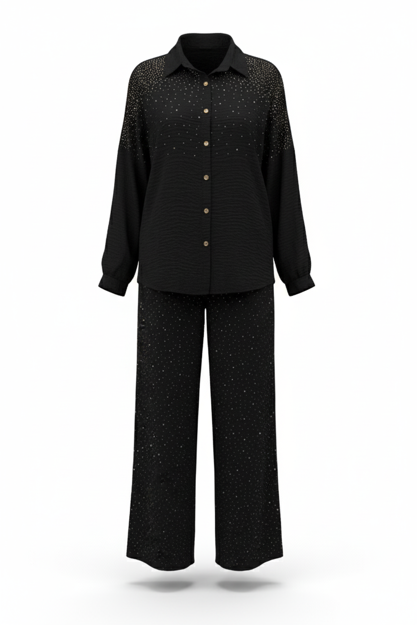 Elegant women’s two-piece set featuring a classic shirt with a collar, front button closure, and long sleeves with buttoned cuffs. The chest and shoulders are adorned with shimmering rhinestones, adding a refined touch. The matching pants come in a wide, comfortable design, fully embellished with rhinestones at the front for a stylish and chic look.