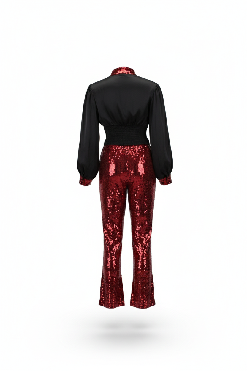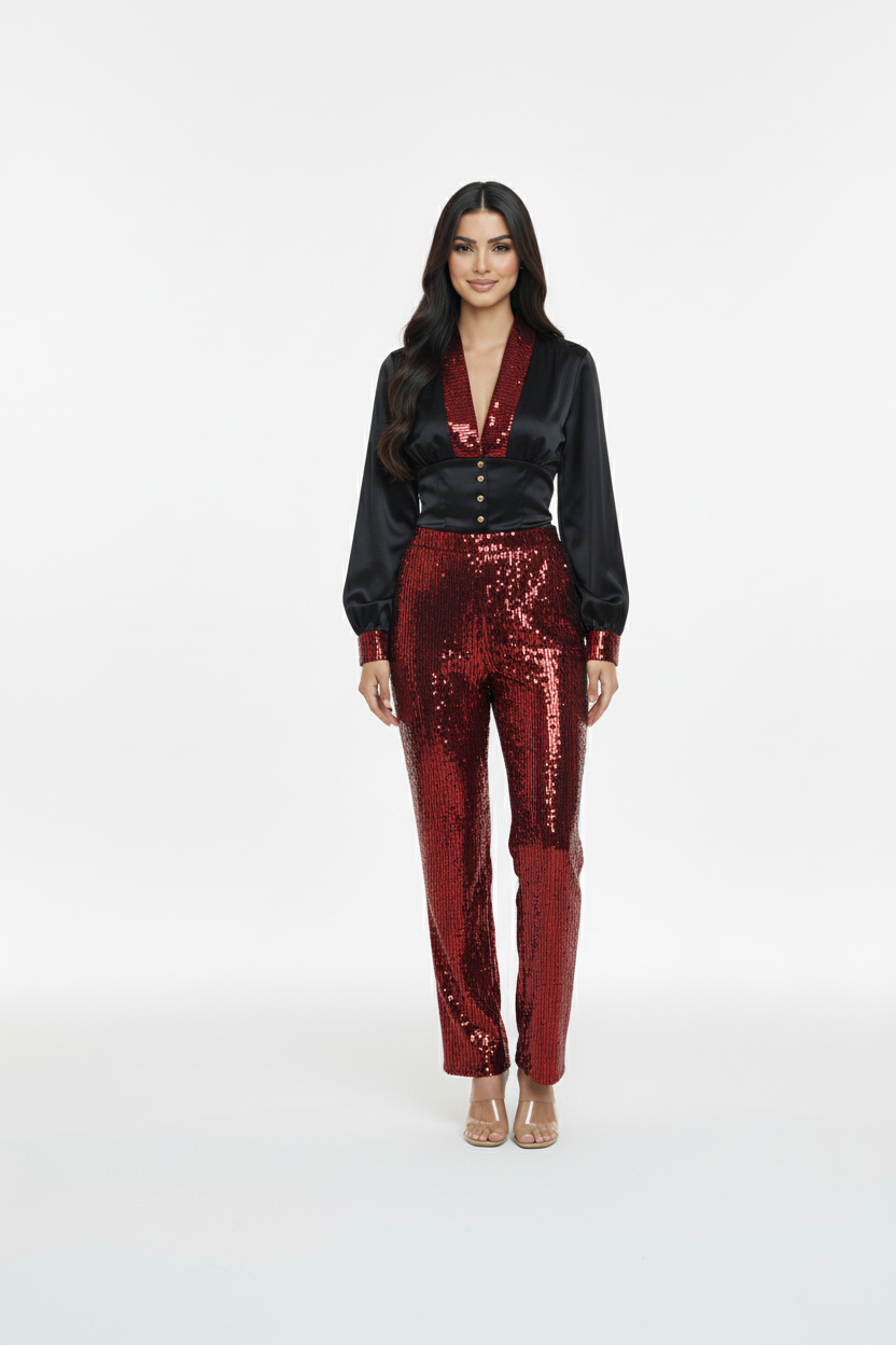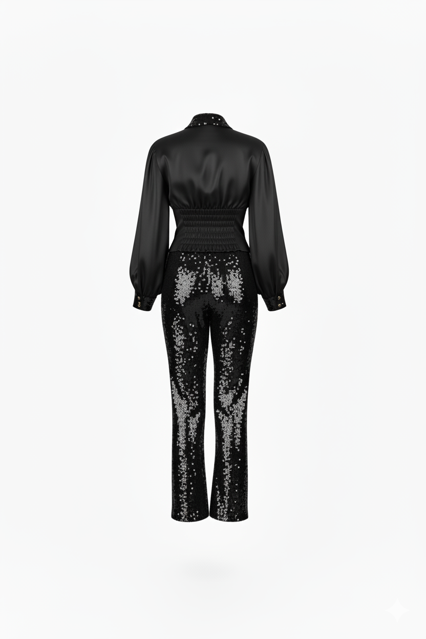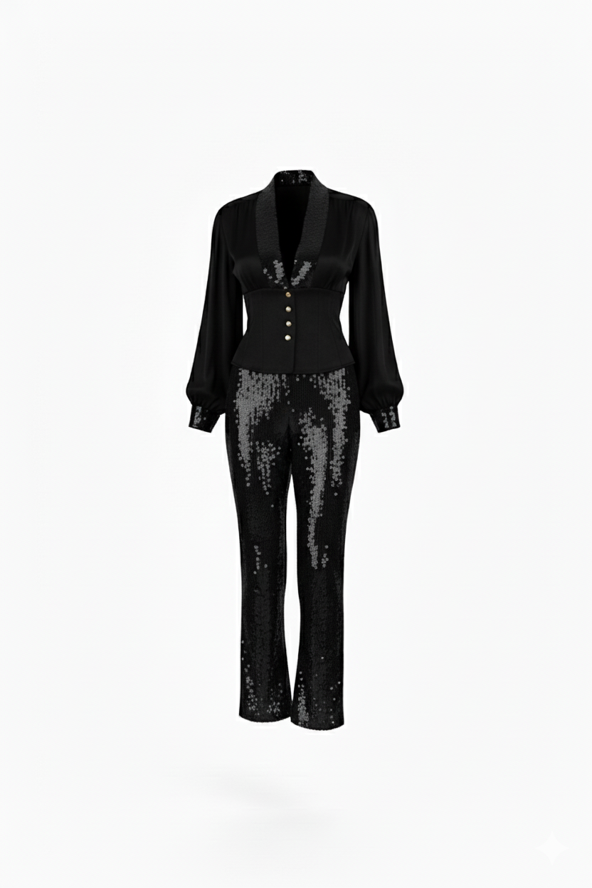 A glamorous two-piece women’s set designed to make a statement. The satin top features a V-neckline adorned with sequins, long sleeves with sparkling sequin cuffs, elegant seam detailing at the bust, and front button closure with a chic high-waist cut. The matching pants are fully embellished with sequins, delivering maximum shine and sophistication. Perfect for evening events and special occasions.