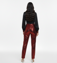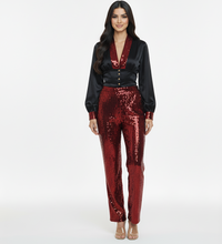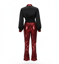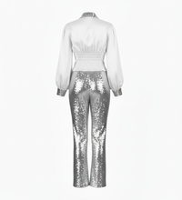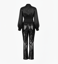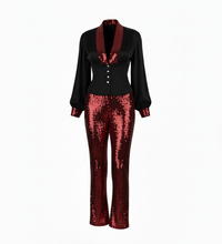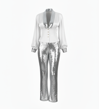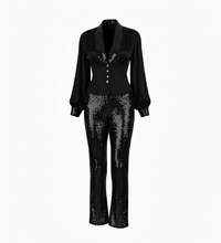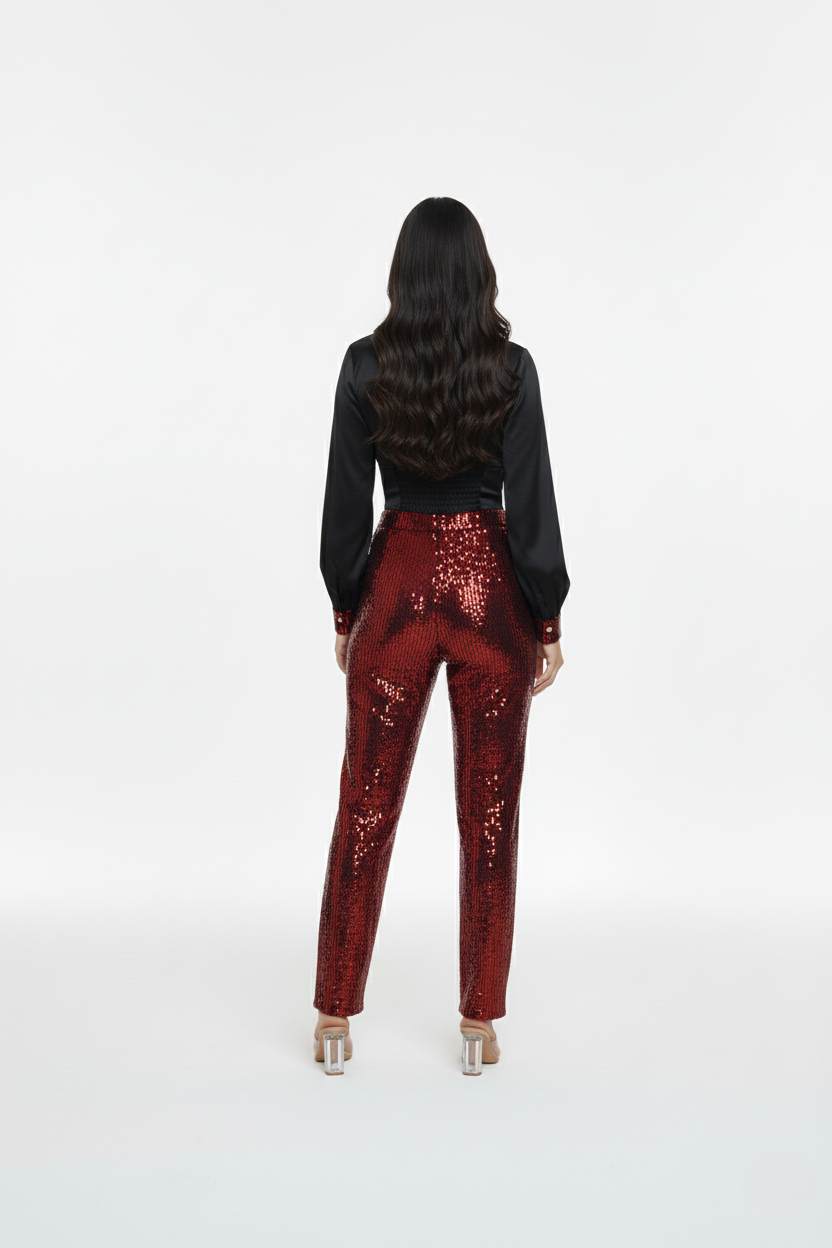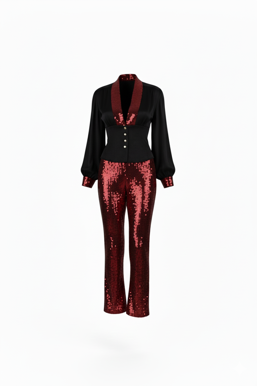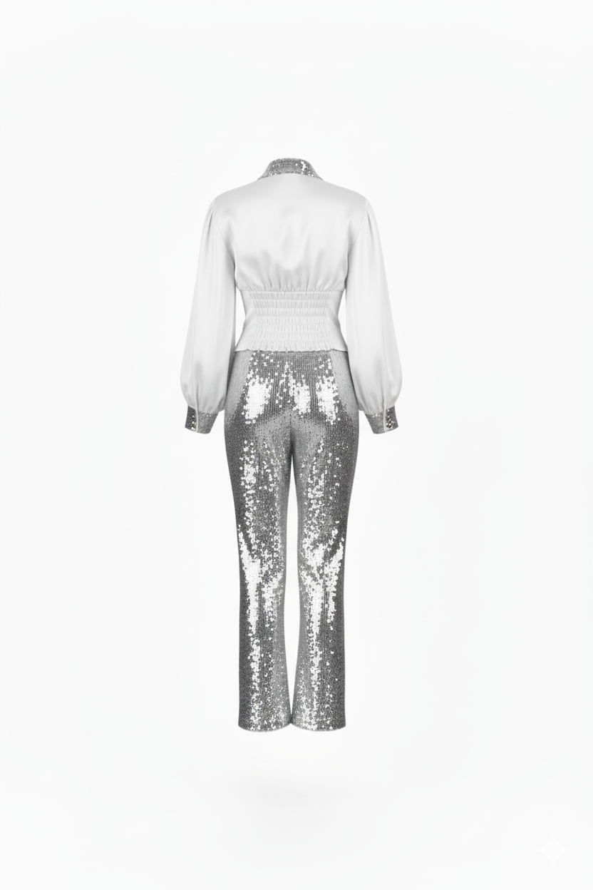 A glamorous two-piece women’s set designed to make a statement. The satin top features a V-neckline adorned with sequins, long sleeves with sparkling sequin cuffs, elegant seam detailing at the bust, and front button closure with a chic high-waist cut. The matching pants are fully embellished with sequins, delivering maximum shine and sophistication. Perfect for evening events and special occasions.