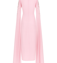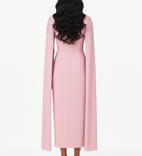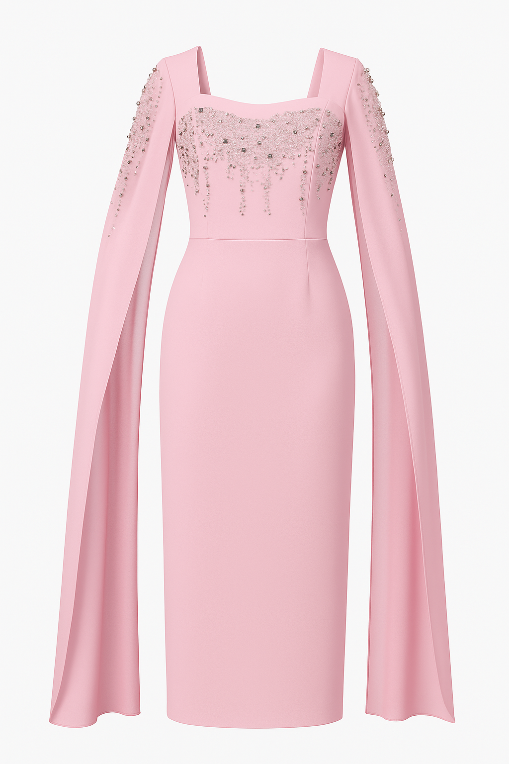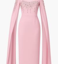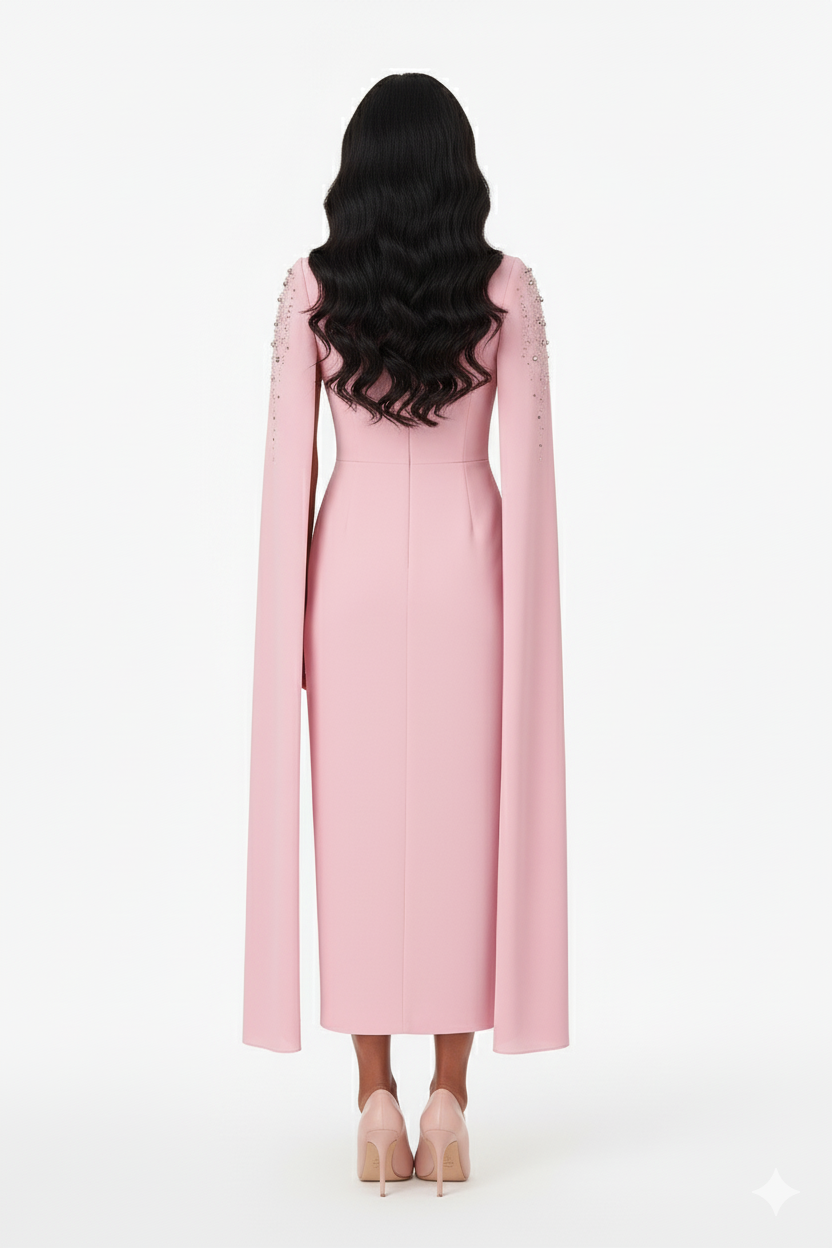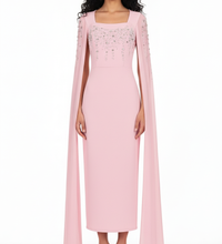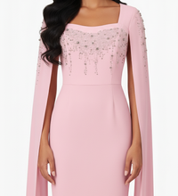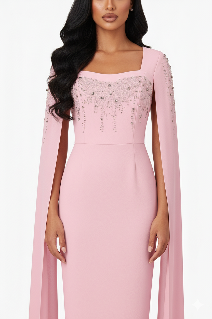 Embrace a soft, feminine allure with this enchanting chiffon evening gown. Designed with a graceful square neckline, it beautifully highlights the neck and shoulders with elegance. The gown features delicate sheer cape sleeves for a subtle, romantic touch, while the bodice and shoulders shimmer with sparkling rhinestone embellishments that add captivating glamour to any special occasion. With its defined waistline, the gown offers a flattering silhouette and a refined look, making it the perfect choice for soirées and elegant celebrations.
