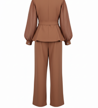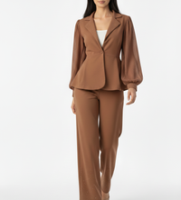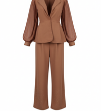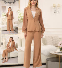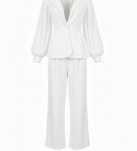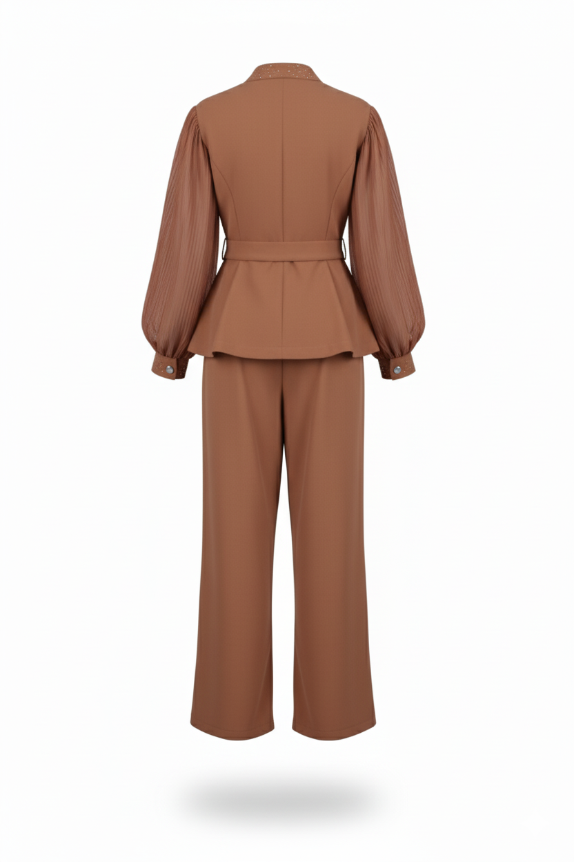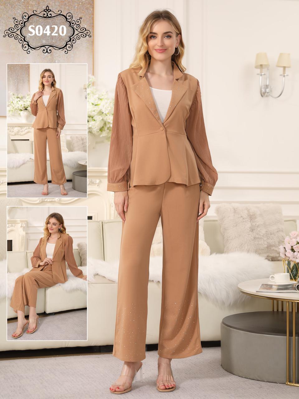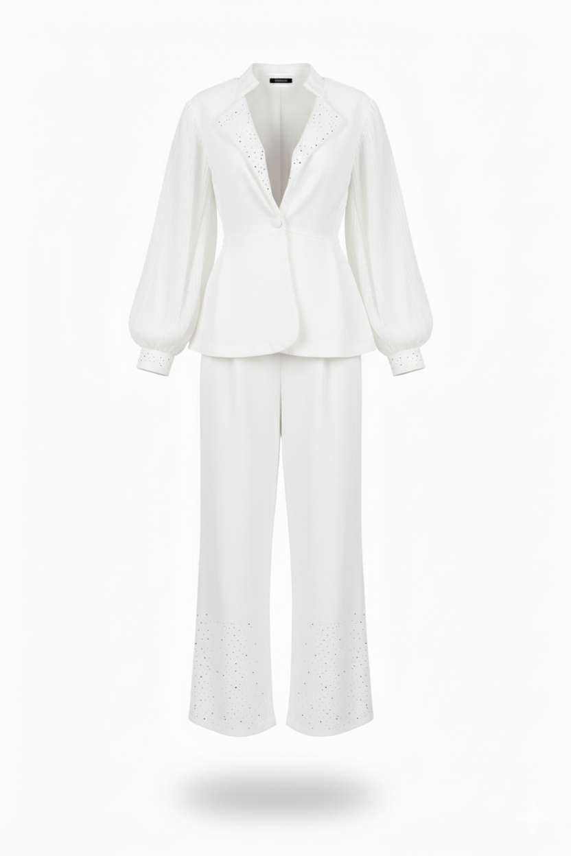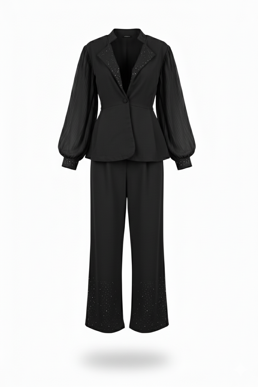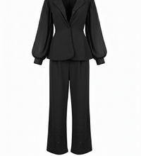 A luxurious two-piece women’s formal set that blends elegance with sophistication. The blazer features a tailored waist fit with a V-neckline and a single front button for a refined closure. Its wide pleated sleeves end with fitted cuffs adorned with rhinestones and a button, while sparkling rhinestone details accent the blazer’s collar and back strap with two snaps. The matching pants are sleek and comfortable, designed with a clean, solid finish and subtle rhinestone touches at the hem—completing the polished, high-class look. Perfect for formal events and business meetings.