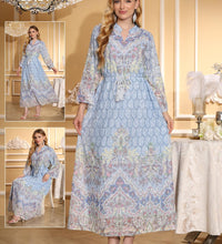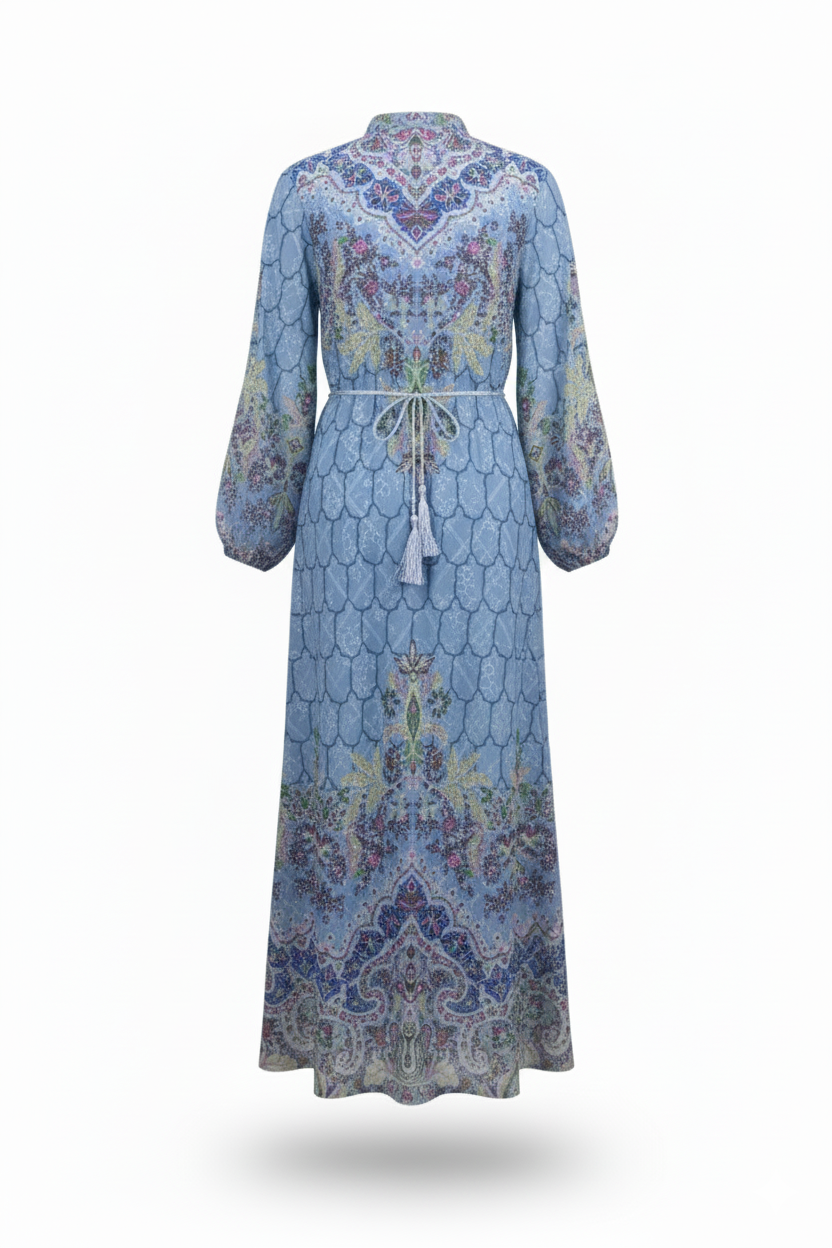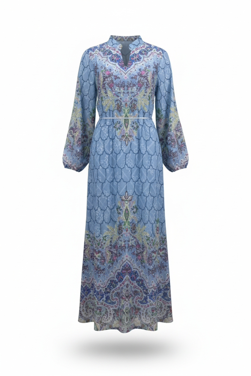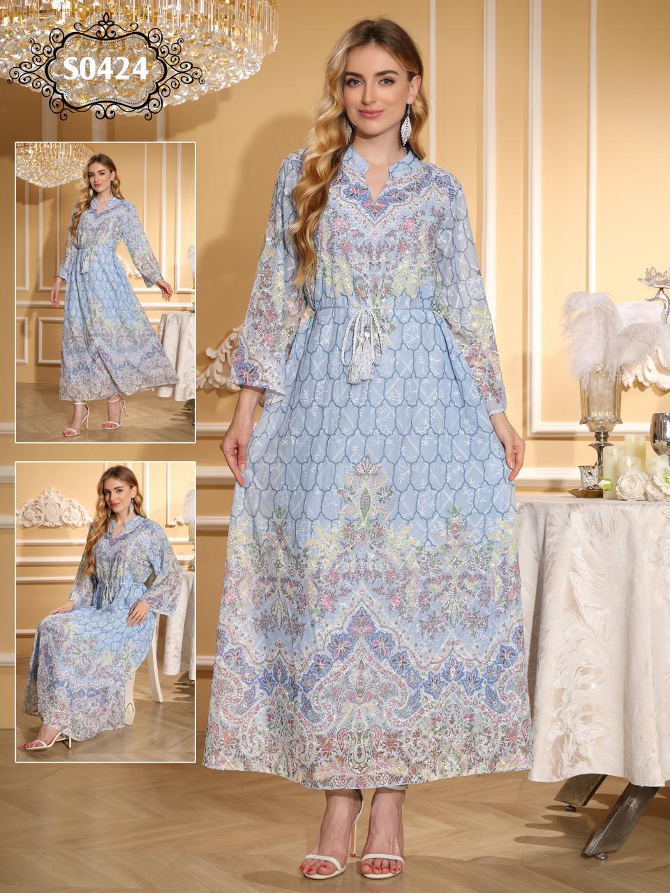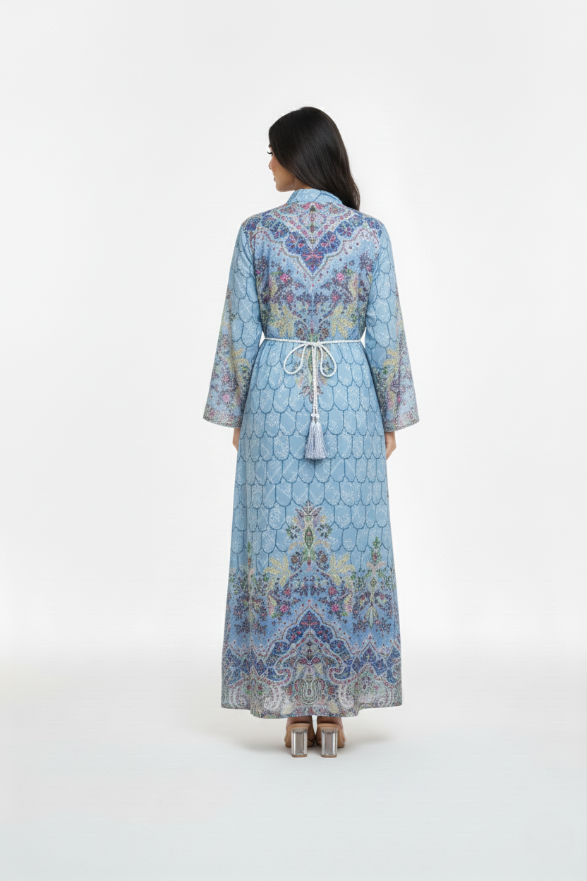 Add a touch of elegance and comfort with this womena's jalabiya made of lightweight chiffon fabric. Designed with a V-neckline and long sleeves for a modest, refined look, it features delicate embroidery on the upper and lower parts, with additional decorative details throughout for a feminine flair. The piece comes with a separate braided waist belt, giving you the option to highlight your figure or enjoy a loose, relaxed fit—perfect for daily outings and casual occasions.