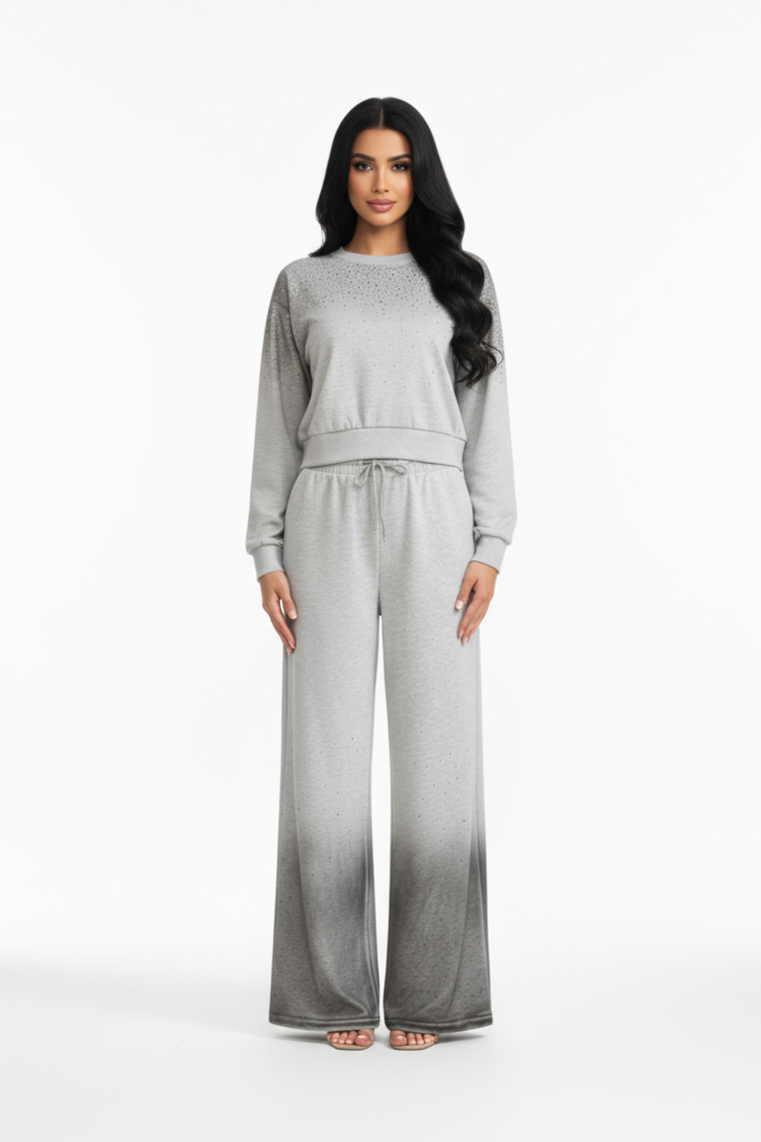 يأتي الطقم ببلوزة قصيرة برقبة مستديرة وأكمام طويلة، مزينة بترصيعات براقة تضيف لمسة من الجاذبية والرقي. أما البنطلون، فيتميز بقصة واسعة مريحة مع خصر مزود برباط شد لضبط المقاس بسهولة، ويتدرج لونه من الرمادي الفاتح إلى الداكن في تدرج لوني أنيق يعزز جمال التصميم.