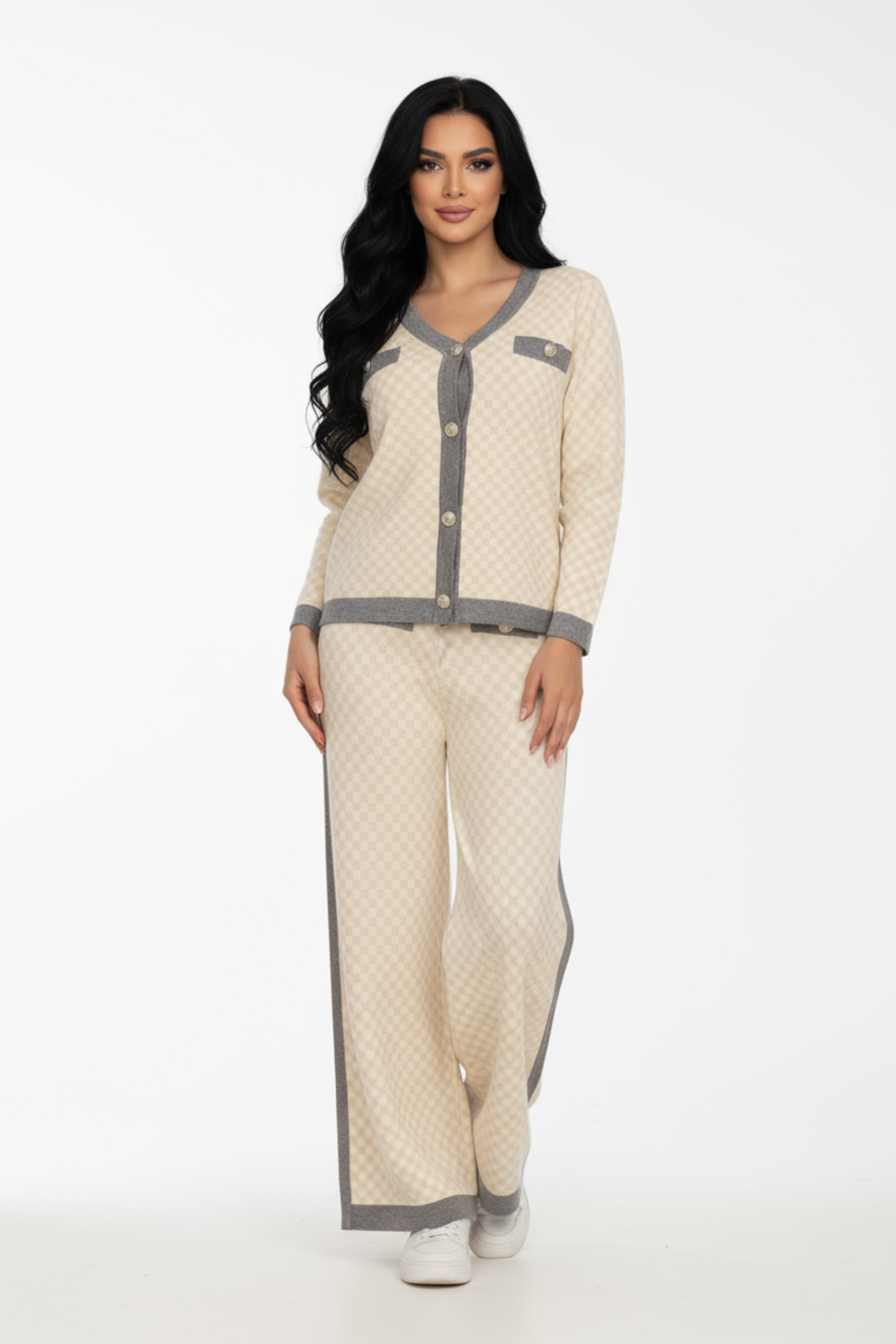 الجاكيت يأتي بقصة كارديجان بأزرار أمامية وياقة على شكل V، أما البنطلون فيتميز بقصة مستقيمة أو واسعة الساقين مع خطوط جانبية رمادية تضيف لمسة عصرية أنيقة.