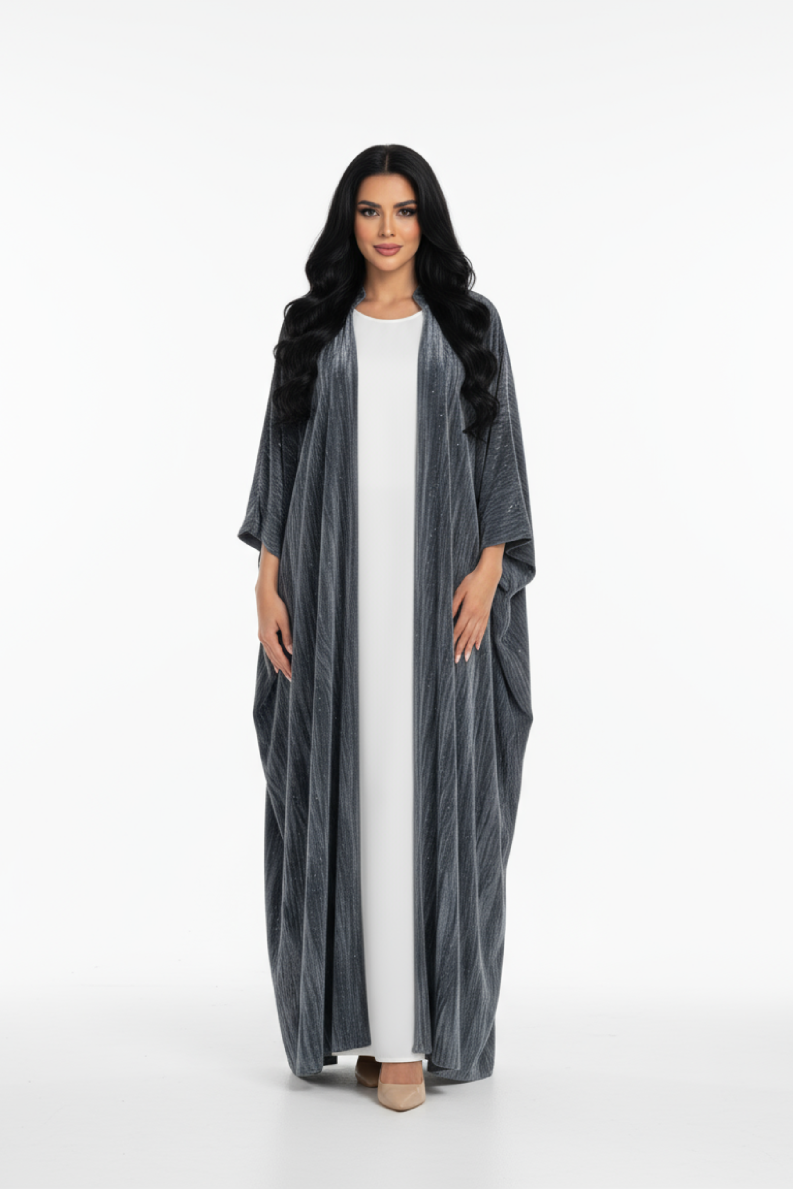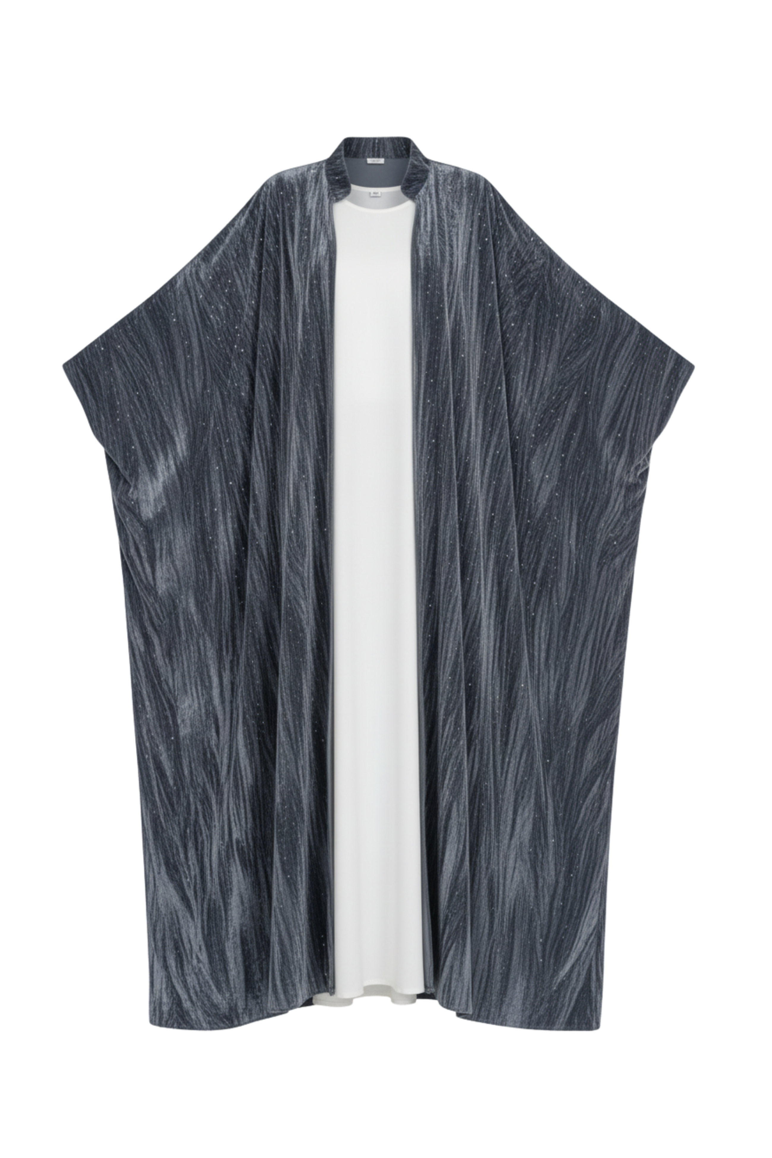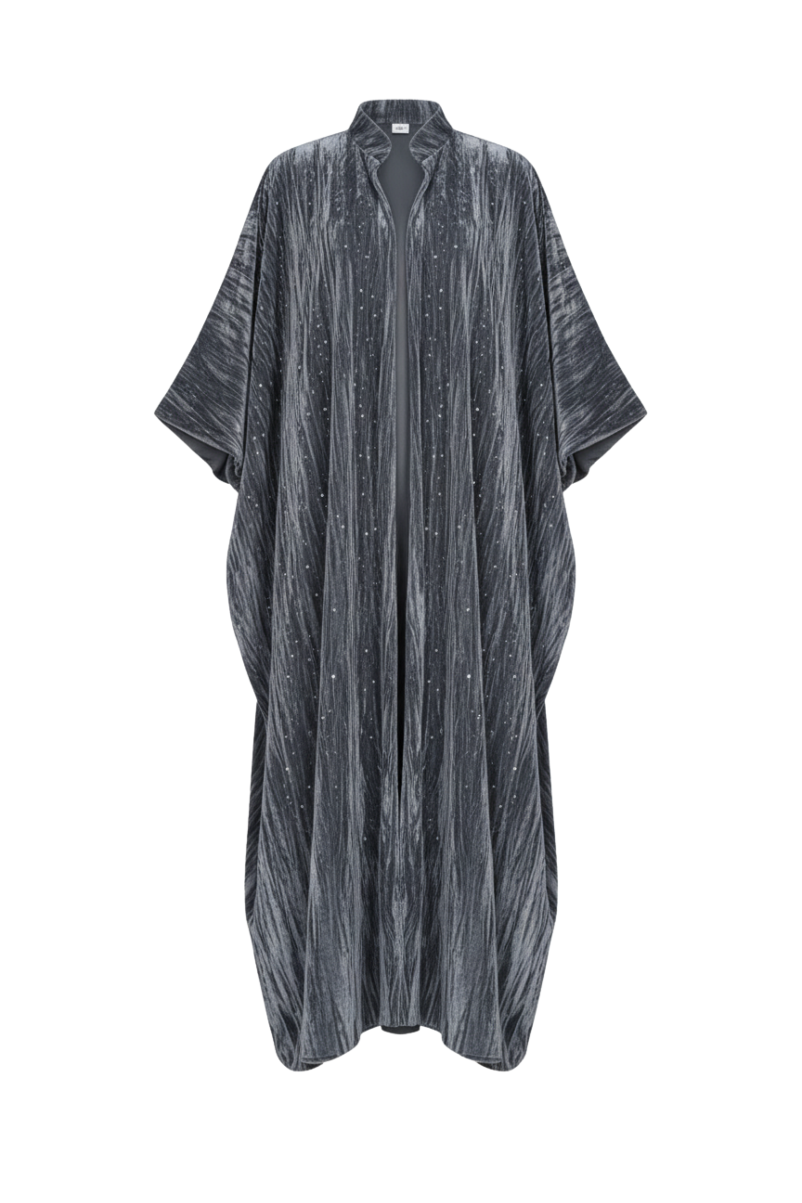 العباءة مصنوعة من قماش مخملي مكسر بلون رمادي داكن يميل إلى الأزرق البترولي، بتصميم واسع وطويل مفتوح من الأمام، مزين بزخارف لامعة من الترتر الفضي تضيف لمسة من البريق الناعم. تأتي الياقة مرتفعة قليلاً لتكمل الإطلالة الملكية.