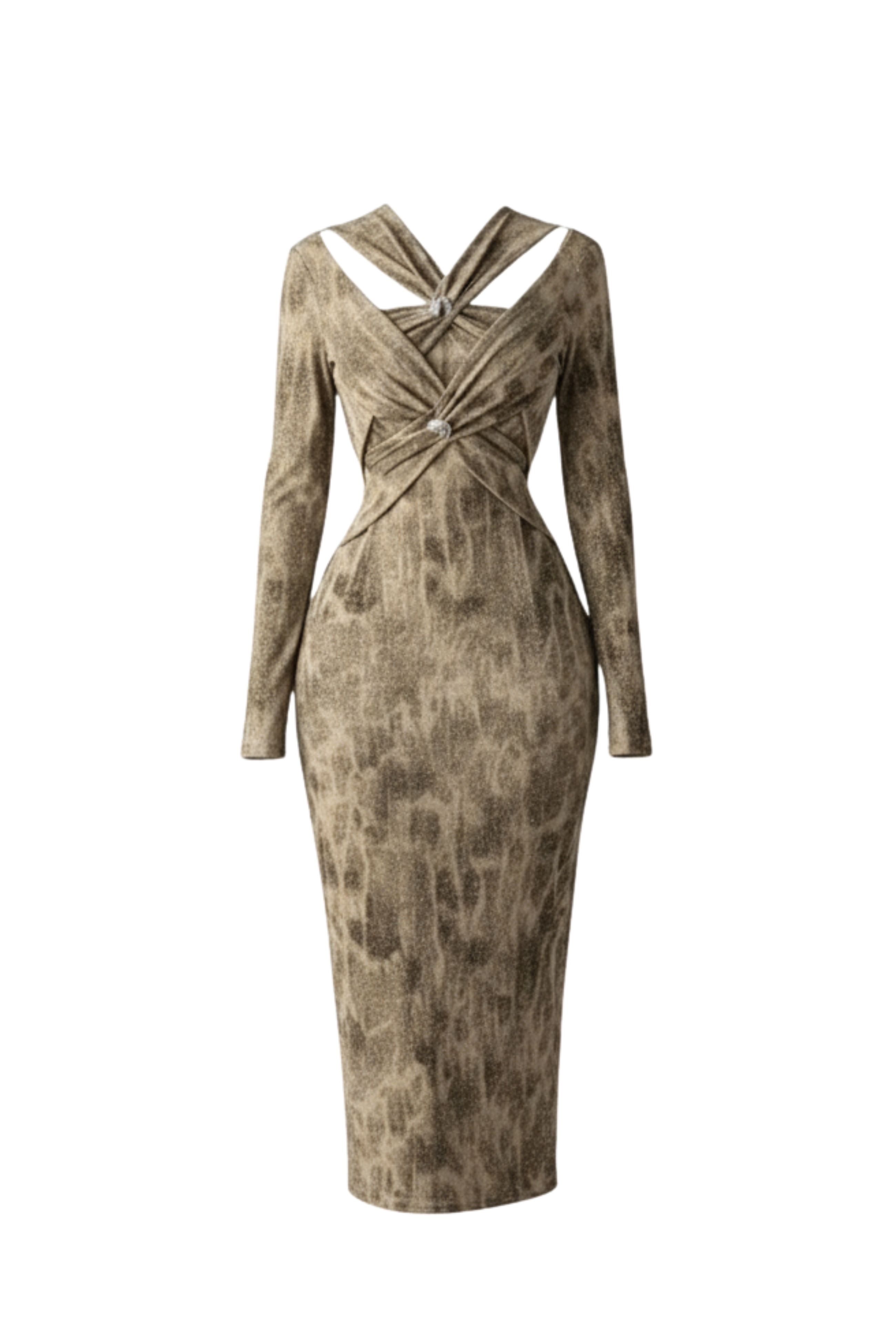 تميزي بإطلالة راقية مع هذا الفستان العصري المصمم بقصة صك أنيقة تبرز جمال القوام. يتميز بتصميم متقاطع عند منطقة الصدر مزين بإكسسوار معدني لامع يضفي لمسة جريئة وعصرية. يأتي الفستان بأكمام طويلة وخامة خفيفة بطباعة ناعمة تناسب المناسبات الخاصة والخروجات المميزة. تصميمه المتوسط الطول يجمع بين الأناقة والراحة، ليمنحك إطلالة تلفت الأنظار.