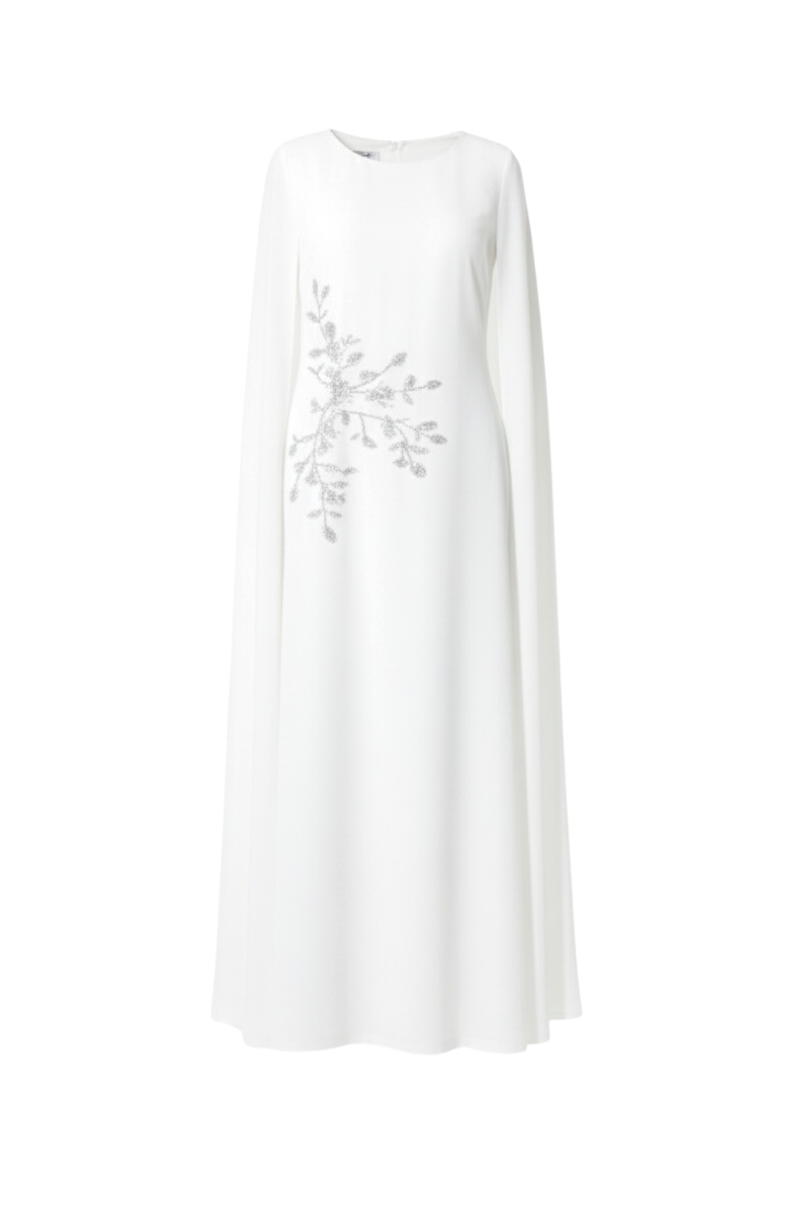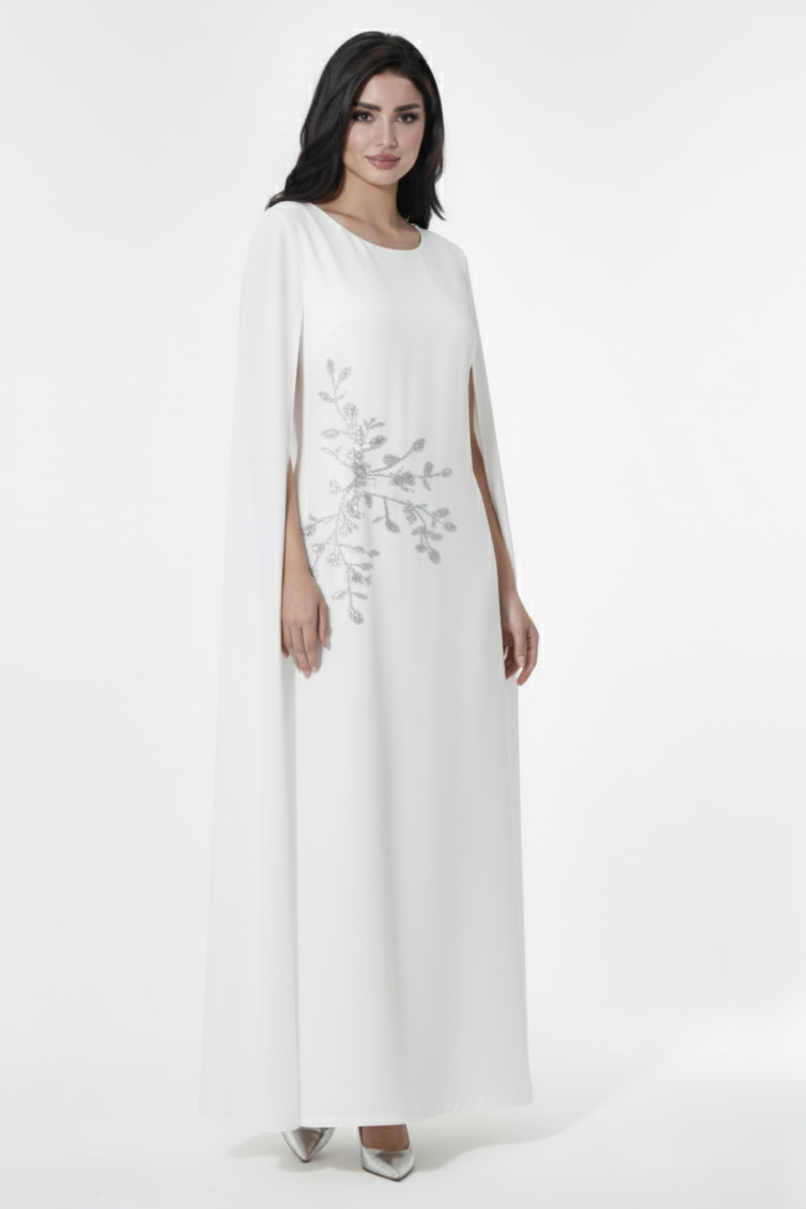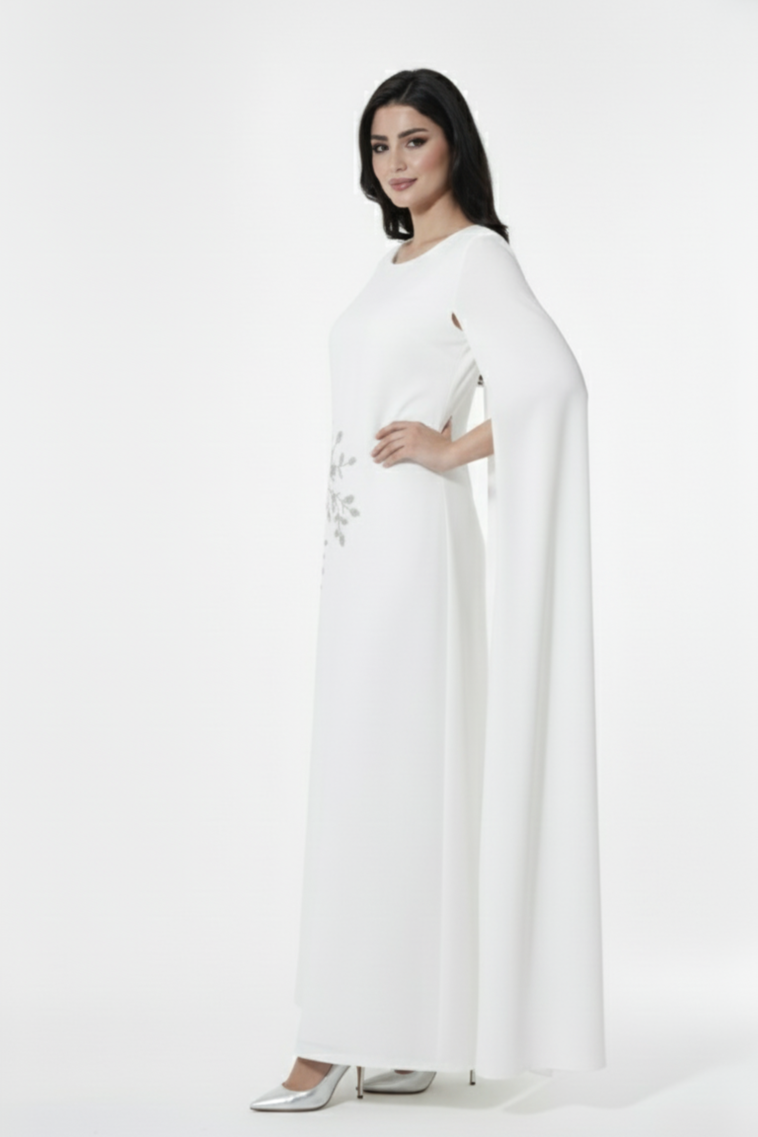 فستان سهرة طويل بلون أبيض نقي يعكس الفخامة والبساطة في آنٍ واحد، يتميز بتصميم الكاب الأنيق الذي ينسدل بانسيابية ناعمة من الكتفين ليمنحك حضورًا ملكيًا راقيًا. زُيِّن بتطريز فضي أنثوي على أحد الجانبين ليضيف لمسة لامعة تخطف الأنظار برقي.