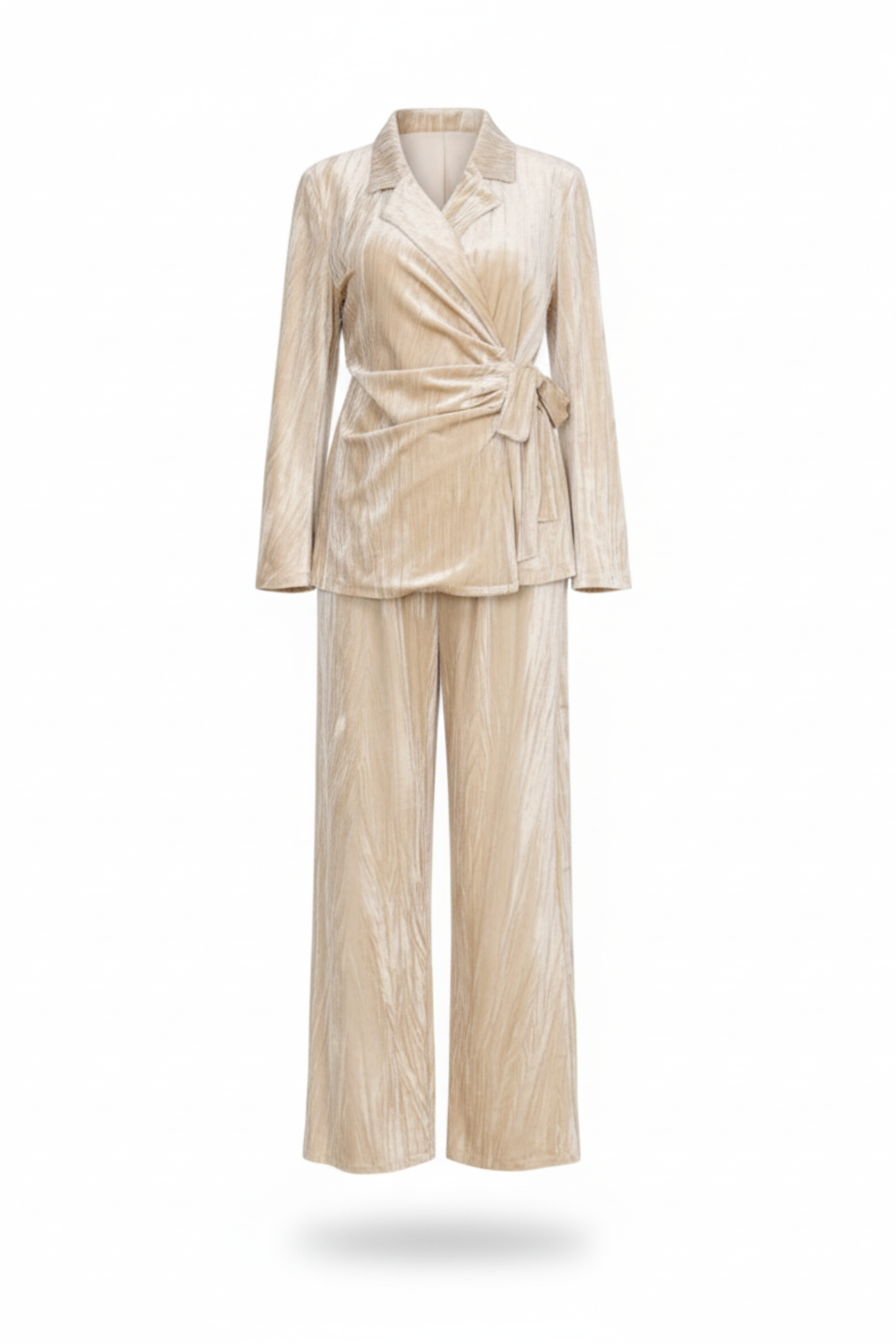 طقم سهرة فاخر بتصميم عملي وأنيق، يتكوّن من جاكيت برباط جانبي وبنطال واسع. يتميّز بخامته المخملية الفاخرة ولمعانه الناعم الذي يمنح الإطلالة لمسة راقية وفخمة. مثالي للسهرات والمناسبات المسائية أو الإطلالات الرسمية الأنيقة.