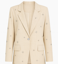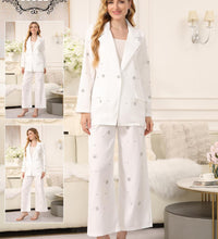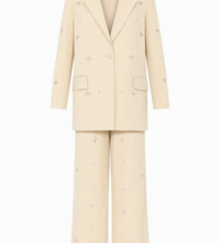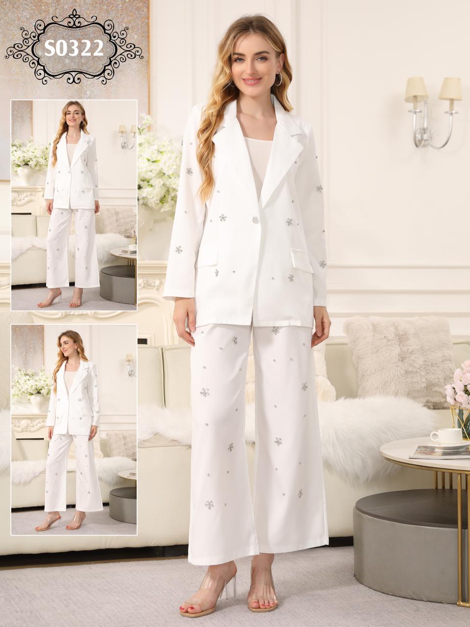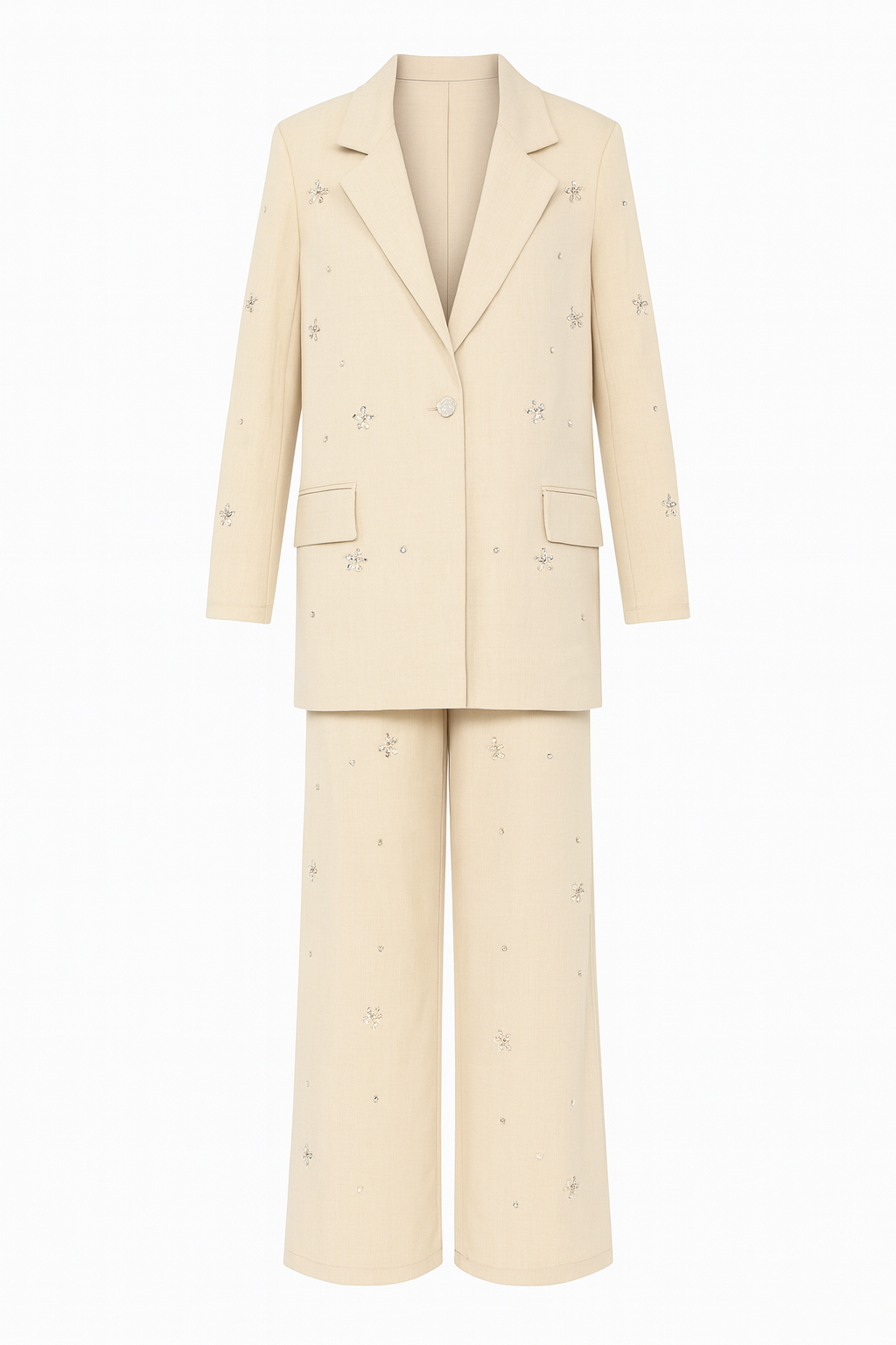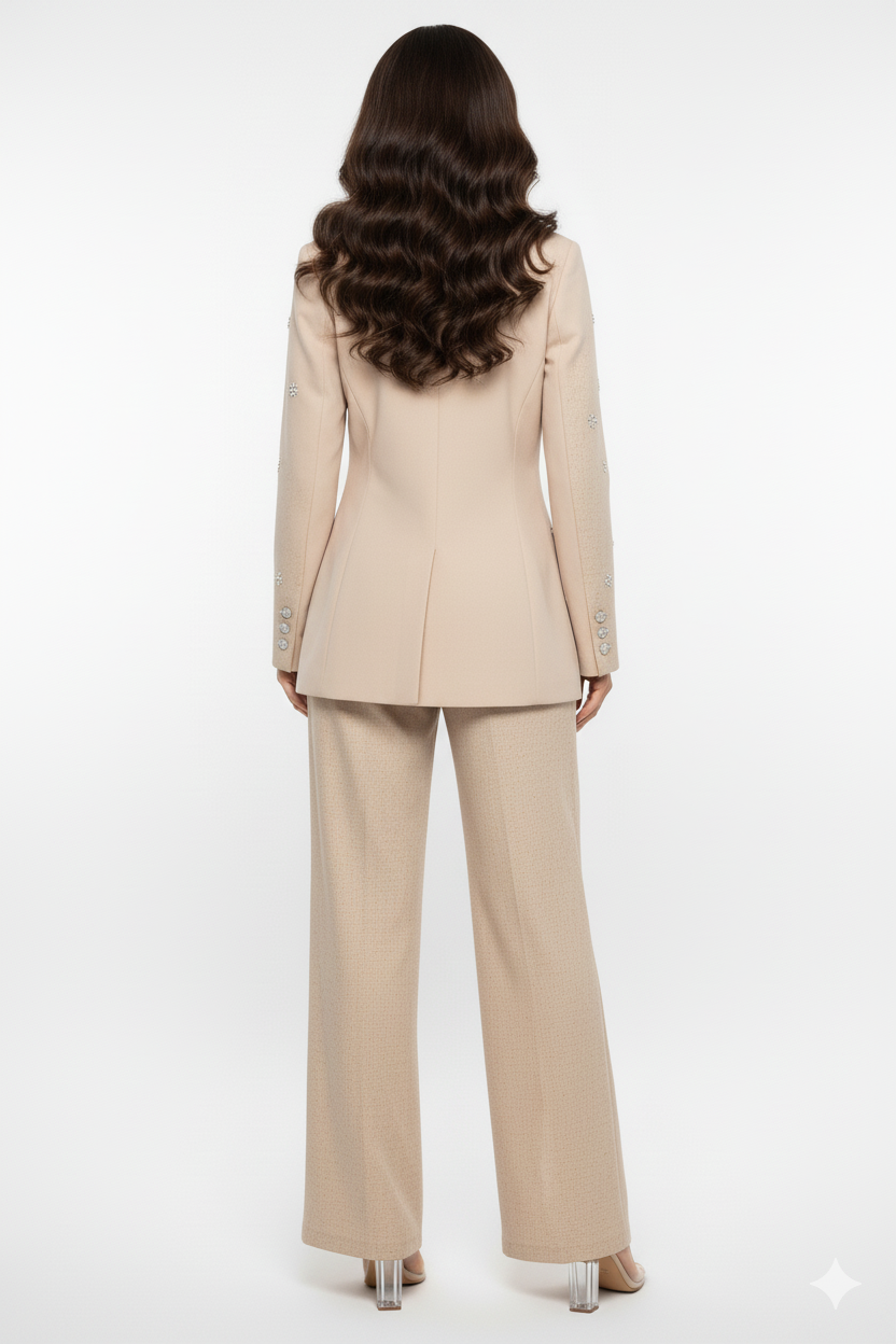 اختاري إطلالة مفعمة بالأناقة مع هذا الطقم الراقي المكون من قطعتين. البليزر يأتي بتصميم مفتوح برقبة V مع زر أمامي للإغلاق وتفاصيل براقة من الفصوص تضفي لمسة فخامة لافتة. أما البنطلون الواسع المريح، فقد صُمم ليمنحك راحة وأناقة في آن واحد، مزين أيضًا بالفصوص مع رباط خصر يضمن ملاءمة مثالية. هذا الطقم هو خيارك الأمثل للسهرات والمناسبات الخاصة التي تتطلب مظهراً مميزاً.